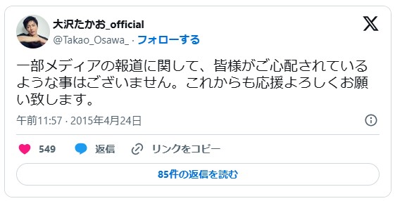 しかし、大沢たかおさんの所属事務所は報道に対し「交際の事実はない」とコメント。